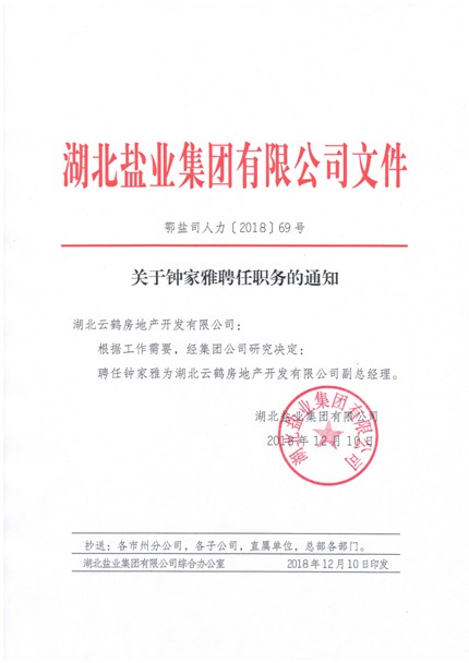 關于鐘家雅聘任職務的通知